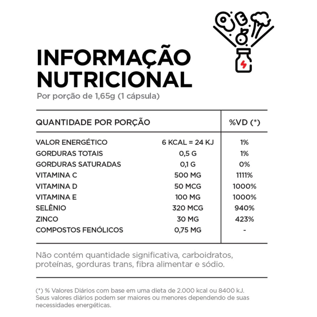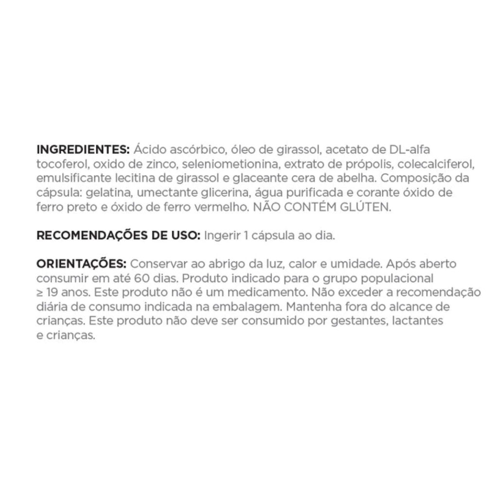 A fórmula especial dessa suplementação, conta com nutrientes selecionados e em alta concentração, como as Vitaminas C, D e E, os minerais antioxidantes Selênio e Zinco, além do poder natural do Própolis Verde. Viu como essa é uma combinação poderosa? Todos esses nutrientes trabalham em conjunto para que você possa estar bem para realizar todas as atividades do seu dia a dia, incluindo a prática de atividades físicas. Você vai perceber melhoras na qualidade de vida.