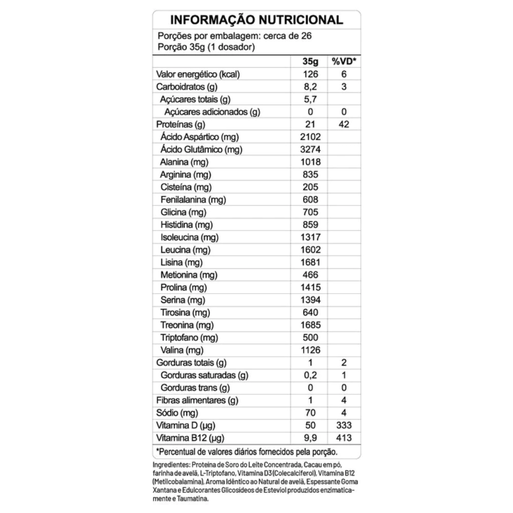 Descubra o poder do Whey Protein Chocolate com Avelã, uma combinação única e inovadora que traz para você o que há de melhor em nutrição: PROTEÍNA CONCENTRADA + VITAMINA B12 + VITAMINA D + TRIPTOFANO + STÉVIA E TAUMATINA. Com 21g de proteína por dose, este suplemento é ideal para quem busca aumentar a massa muscular e melhorar a performance nos treinos.